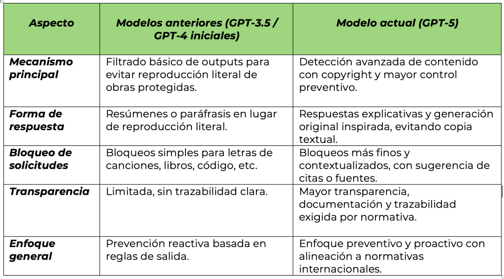 Y para muestra de cómo se están adaptando los modelos a las nuevas exigencias regulatorias, veamos este ejemplo: Se hizo la consulta a ChatGPT5, respecto a cómo se diferenciaba ELLA de sus anteriores versiones, respecto a la protección de derechos de autor, y esta fue su respuesta: