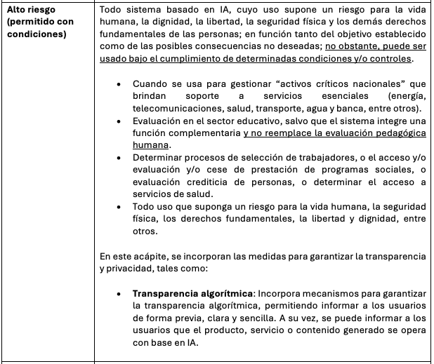 - En sistemas basados en IA – Riesgo Alto: Mantener registro actualizado y accesible, con enfoque preventivo, sobre los principios del funcionamiento del sistema, las fuentes de datos utilizadas y la lógica del algoritmo, los impactos sociales y éticos esperados.